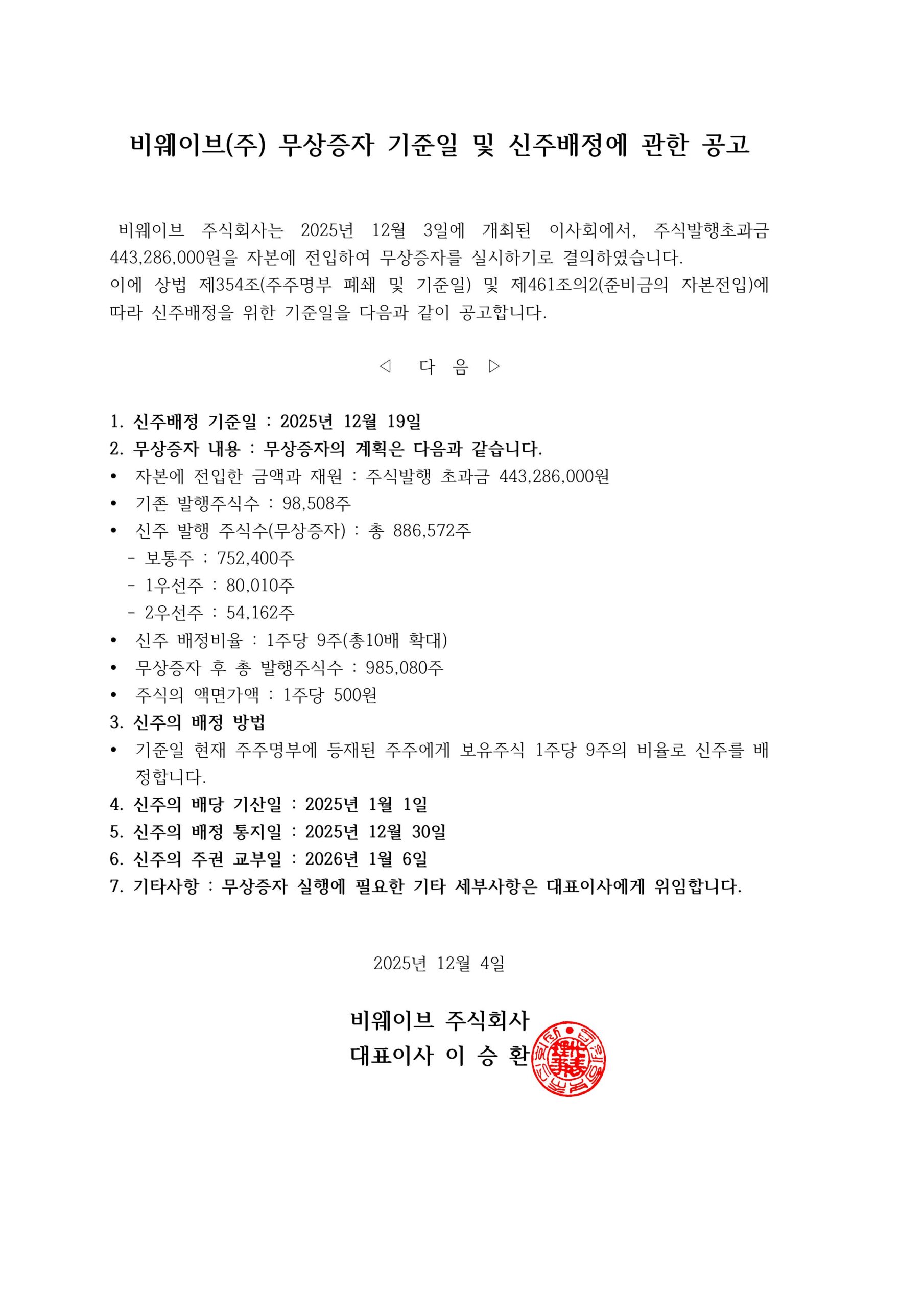 비웨이브(주) 무상증자 실시 안내